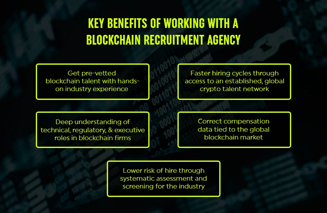 Blockchain is a fast-moving industry, and one hiring mistake can be expensive for businesses. That’s where a specialised agency removes the guesswork and finds the right talent while reducing the risks. Here is how they help: